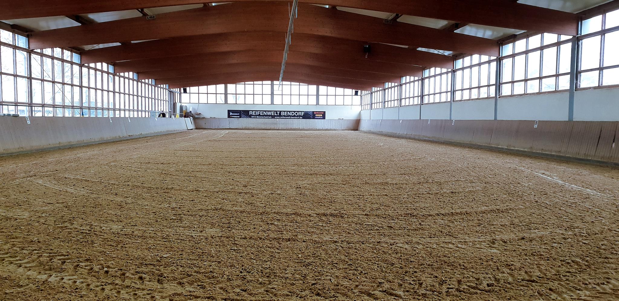 Unsere Panorama-Reithalle bietet die Maße 20 m x 60 m und ist mit Heus-Reithallenboden mit Vlies ausgestattet. Zudem sorgt eine Beregnungsanlage für staubfreies Reiten.